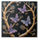 A square tile with a dark green background, featuring a raised design of golden branches and purple butterflies. The branches curve around the edges of the tile, with small, stylized pine needles extending from them. Three purple butterflies are perched on the branches, each with intricate wing patterns and delicate antennae.