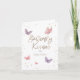 Butterfly Kisses Dankeschön-Karte mit flatternden lila und rosa Schmetterlingen und Golddots.