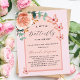 Eine Rose mit goldenem Hintergrund mit einer Rose aus Gold und rosa Bogen. Dekoriert mit einer Rose Gold und rot rosa Blumen, Blume der Rose, grüne Aquarell Eukalyptusgrün und Schmetterlinge. Personalisieren und fügen Sie den Namen der Mutter zu sein und Party-Details. Text: Ein kleiner Schmetterling ist auf dem Weg. Zurück: Rose goldene Hintergrundfarbe. 1 Blatt = 1 Einladung mit Druckkante bis Kante.