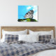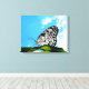Nahes Foto eines wunderschönen gepunkteten Schmetterlings in Schwarz/Weiß auf einem Blatt mit blauem Himmel und weißem Wolkenhintergrund.