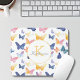 Schöner individuelle Name Mouse Pad mit einem farbenfrohen Schmetterlingsmuster. Mouse Pad mit personalisiertem Namen in nahtlosen zarten Schmetterlingen in Rosa, Lilie, Gelb und Blau.