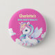 Button to a magical birthday party with an adorable unicorn with wings in the clouds.