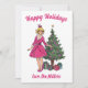 Diese Retrokarten sind sicher ein Hit! Das Kunstwerk zeigt ein Vintages Aquarellbild einer blonden Frau in einem rosa Kleid, das einen Weihnachtsbaum schmückt. Die Karte steht oben auf "Happy Holidays!" und am unteren Rand können Sie Ihren Familiennamen hinzufügen.