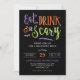 Invitation tes amis et ta famille à ton Bain d'Halloween dans le style avec cette invitation de fête d'Halloween moderne! Avec les mots "Mangez, Buvez et Soyez effrayants" dans un jeu de couleurs violet, orange, noir et vert, il ne serait pas plus facile de customiser le modèle pour s'adapter à votre fête!