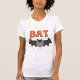 Ein schwarzer Halloween-Fledermaus und ein orangefarbener Text, der auf Fledermaus-T - Shirt, Karosserietexten, Tasse, Karten, Aufklebern, Totttaschen, Buttons, Magneten und anderen Halloween-BAT-T - Shirt und -Geschenken "BAT" liest.