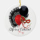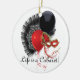 Rundschmuck mit beidseitigem Bild eines schwarzen Federlüfters, roten und schwarzen Ballons und roter Keramik. Optionaler Text Sehen Sie sich die gesamte Kollektion von Cancan Ornament in den SPEZIELLEN TOUCHS an | Abschnitt Gastgeschenke.