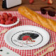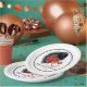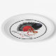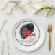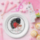 Set von acht 9" Papier-Tellern mit Kabarettbild eines schwarzen Federlüfters, roten und schwarzen Ballons und roter Maske. Siehe dazu passende Süßigkeiten, Espressotasse, Tasse, Kolben, Krug, Schuss Glas, Teekanne und Untersetzer. Sehen Sie sich die gesamte Cancan Plate Kollektion im NAHRUNGSMITTEL/BEV an. | Abschnitt Geschirr.