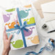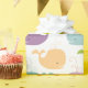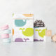 Motif adorable avec des baleines colorées dans les tons violet, bleu, vert et orange.