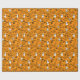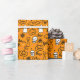 Papier enveloppant avec un design minimaliste moderne pour Halloween, un motif de silhouettes de crânes, fantômes, toiles, une silhouette de chat, citrouilles sur un arrière - plan orange.
