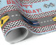 Présentez votre cadeau d'anniversaire en ce papier d'emballage orienté de emballage de fête. Les caractéristiques de conception un motif de répétition avec des courses d'automobiles de course en bas des voies, un motif noir et blanc de damier, damier diminue et les mots, "joyeux anniversaire !" composé en rouge sur un fond bleu.