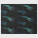 Méduse néon brillante, turquoise et bleue avec une pointe de vert, nageant par contre un arrière - plan noir.