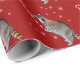 Enveloppez vos présents avec un raton laveur adorable mangeant un sucre de canne géant entouré par des flocons de neige sur un arrière - plan rouge.