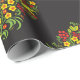Papier d'emballage russe Hohloma, art russe, fraises rouges, feuilles jaunes, arrière - plan noir