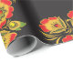 Papier d'emballage russe Hohloma, art russe, fraises rouges, feuilles jaunes, arrière - plan noir