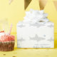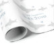 Papier à envelopper montrant une maman et un bébé requin dans un motif extensible. Ce papier d'emballage comprend également un nom et un événement personnalisables.