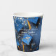 Elegante Papiertassen mit Caduceus, Blue Mortarboard/Grad Caps mit Goldtassel, für Ihren Doktoranden. Hübscher Hintergrund in marineblau mit goldenem Konfetti und blauem Mörtel . Geben Sie Ihren Namen, die Universität und Ihr Jahr des Abschlusses ein.