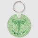 Single Schlangen Kadukeus mit Minzfässern auf hellgrünem, nahtlosem Hintergrund. Benutzerdefinierter Text auf beiden Seiten.
