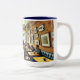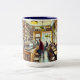 Die Aquarellmalerei zeigt das Innere einer kleinen, engen Kaffeebar in Vancouver. Der Raum ist eng mit Holztischen und Stühlen übersät, was eine belebte und gemütliche Atmosphäre schafft. Die Ziegelwände sind mit gerahmten Fotografien und kleinen Pflanze geschmückt, was eine persönliche und rustikale Touch verleiht. Der kompakte Tresen aus Holz ist mit Gebäck und Vintager Espressomaschine ausgestattet. Ein Barista in einem karierten Shirt ist damit beschäftigt, eine Reihe von Kunden zu bedienen, während Gönner Schulter zu Schulter sitzen, Kaffee trinken oder auf Laptops arbeiten. Die warme gelbe Beleuchtung und einige Lichtstreifen aus einem kleinen Fenster verleihen diesem lebhaften Café einen besonderen Charme
