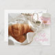 Hübsche, helle Postkarte mit einem Café-Komplet oder einem kontinentalen Frühstück. Das Bild zeigt Croissants, Vintages Silbergeschirr und Porzellan.