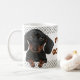 Une tasse potable orientée de teckel, idéales pour le propriétaire de teckel ou pour les personnes qui adorent juste des teckels ! Les caractéristiques de conception de tasses deux ont peint des tableaux des chiots mignons de teckel avec café des textes du "Mmm… !".