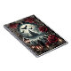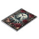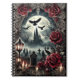 Cette image montre un paysage inspiré de l'esthétique gothique, combinant des tons sombres, des contrastes dramatiques, des roses et des détails décoratifs. Au centre de l'image se trouve un château mystique sous la lumière de la pleine lune, un cimetière au premier plan et des roses rouges encadrant la vue. Les oiseaux noirs volant à l'arrière-plan ajoutent une atmosphère sombre à la scène.