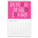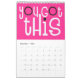 Bon calendrier de vibes avec un message positif pour chaque mois de l'année en audacieuse typographie décalée. Les couvertures avant et arrière ont un arrière - plan blanc avec des lettres roses et noires funky, et à l'intérieur de la couleur arrière - plan est en rose chaud partout avec la typographie blanche avec des points chauds rose et noir. Vous pouvez modifier les couleurs de l'arrière - plan si vous le souhaitez via l'option Cliquez pour Customiser plus.