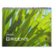 Fresh Greens est un calendrier rempli de photos originales de feuilles et d'autres verts naturels. Les photos donnent sur des vues rapprochées de feuilles de palmiers, de feuilles d'éléphants, de graminées marines et même du basilic aux herbes. Les couleurs du vert vont du jaune clair vert et du vert citron tropical au vert foncé de la forêt. Certains feuilles sont mis en valeur par la lumière du soleil, d'autres sont dans l'ombre et parfois des bouts de ciel bleu tropical s'élèvent à travers. C'est un calendrier pour nous rappeler chaque mois de penser vert, de vivre vert.