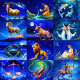 Calendrier en douze illustrations originales des signes des signes astrologiques du Zodiac, avec des cieux bleu profond, étoilés