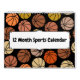 Un calendrier de 12 mois représentant le snowboard, le ski, le basket-ball, le baseball, le golf, le vélo, la natation, le tennis, le football, le patin à glace et le football avec quelques poussins et noix jetés dans.