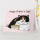 Eine niedliche Calico-Katze sitzt neben ihrer Speisekarte und wünscht ihrem Cat-Vater einen glücklichen Vatertag.