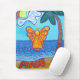 Das kalifornische Angel-Gemälde zeigt einen gelb-orangen Engel, der über den Ozean schwebt, mit den Worten "Freude" auf einer Wolke, die durch die Sonne guckt. Die Worte "Ruhe" erscheinen unten auf dem Sand als Nächstes. Am Strand wächst eine fröhliche Palme. Weitere Informationen zu diesem Bild finden Sie unter www.donnabellasangels.org/art/angel/california-beach-angel.html
