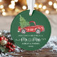Script de calligraphie moderne Coeur Notre premier Noël en tant que M. et Mme - Aquarelle Vintage de camion rouge - Arrière - plan vert de forêt
