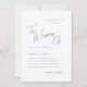 Cette faire-part de mariage élégante, chic et minimaliste présente une toile blanche propre, une calligraphie délicate, aérée, dans des tons bleus assez poussiéreux.