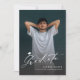 Calligraphie moderne Invitation de graduation avec capuchon de graduation et photos devant et derrière, simple et unique. Personnalisez-le avec vos propres photos et informations sur les grandes fêtes.
