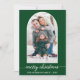Moderne Kalligraphie Script Frohe Weihnachten Familie Foto Arch Holiday Card. Waldgrüner Hintergrund mit Schneeflocken zurück.