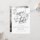 Cette élégante invitation combine un rendu orné de script de Save the Date avec une police de style traditionnel. Facile à personnaliser avec vos détails mariages et ajouter une photo douce du couple heureux sur le dos. Belle !