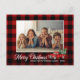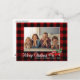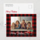 Ein wunderschöner rustikaler Stil, rot kariert - tartanische Urlaubspostkarte mit einem Vintagen Aquarell, der mit Bäumen beladen ist, mit Kalligrafieschrift "Frohe Weihnachten", Ihrem Familiennamen, Jahr oder anderem Foto und Ihrem Familiennamen. Personalisieren Sie Ihre Nachricht auf der Kartenrückseite für die perfekte Touch.
