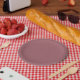 Solid mauve texture background with subtle vertical and horizontal lines, creating a fabric-like appearance. Conveys a soft, elegant feel.