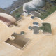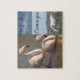 Puzzle, das größere Flamingos und ein weißes Pferd im Camargue, Provence, Südfrankreich zeigt.