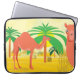 In diesem Felsen befinden sich 2 Kamele in der Wüste, in der Nähe einiger Palmen.