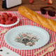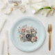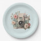 Paper plates with a vintage styled camera decorated with flowers. Pastel colors of pink, cream and green.