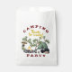 Sacs de faveur de la fête de camping avec texte "merci d'être venu". Papier blanc (ou kraft) avec conception de camping de tente, y compris un feu de camp, un péage, des jumelles, une tasse et des thermos. Texte courbé en haut pour "camping" texte ou autre.