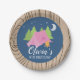Camping Geburtstagsparty Teller mit rosa Zelt, Bäumen und Holzboden.