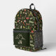 Camping- und Wanderkhaki grüner Rucksack gemustert mit Zeltdoodle-Elementen in Grün- und Brauntönen. Die Vordertasche hat ein rustikales Gebirgsdesign gegenüber dem individuell anpassbaren Text