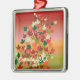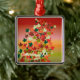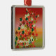 Eine lockere Formation von bunten Ahornblättern fällt sanft vor dem Hintergrund eines lebendigen kanadischen Sonnenuntergangs auf einem Ornament mit koordinierendem roten Band.