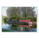 Das helle Rot eines schmalen Bootes spiegelt sich im stillen Wasser des Kanals in einer idyllischen Landschaft wider