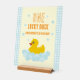 Un canard chanceux ! Premier anniversaire avec canard en caoutchouc et bulles contre un en vichy bleu clair et arrière - plan jaune pâle avec texte orange