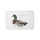 Ce tapis de bain d'animal comporte un canard de canard entouré par la neige pelucheuse d'une tempête tôt. Son cou iridescent vert, bec jaune et ailes complexe modelées se tiennent vraiment contre le tout ce que blanc !