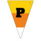 Diese dreilangförmigen Bruststücke haben orangefarbene, gelbe und weiße Streifen, die sie wie Bonbons aussehen lassen. Schwarze Buchstaben buchstabieren die Nachricht: GLÜCKLICH HALLOWEEN.