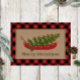 Illustration eines roten Kanus mit Weihnachtsbeleuchtung und Christbaum im Inneren. Hintergrund ist brauner Karton mit kariertem roten und schwarzen Büffel. Personalisieren Sie den Text im Inneren.
